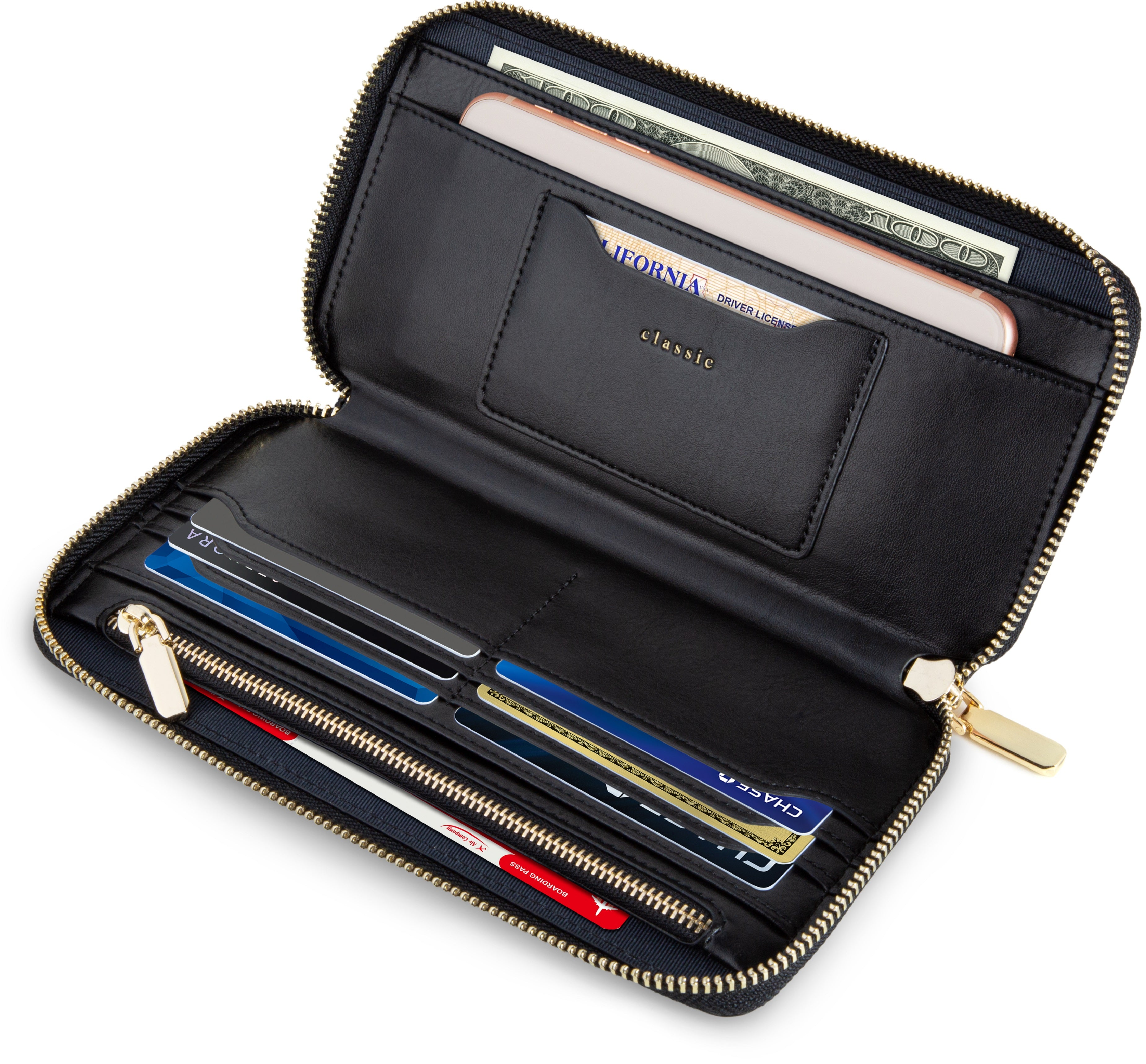 The Soft-Lined pocket protects your phone (up to 7”), while the second flat pocket fits passports, check book, tickets, or notes. And, the secure Zip-Pocket is for coins, keys and keepsakes. It’s big on storage while also performing perfectly as a slim, minimalist wallet or pocketbook.