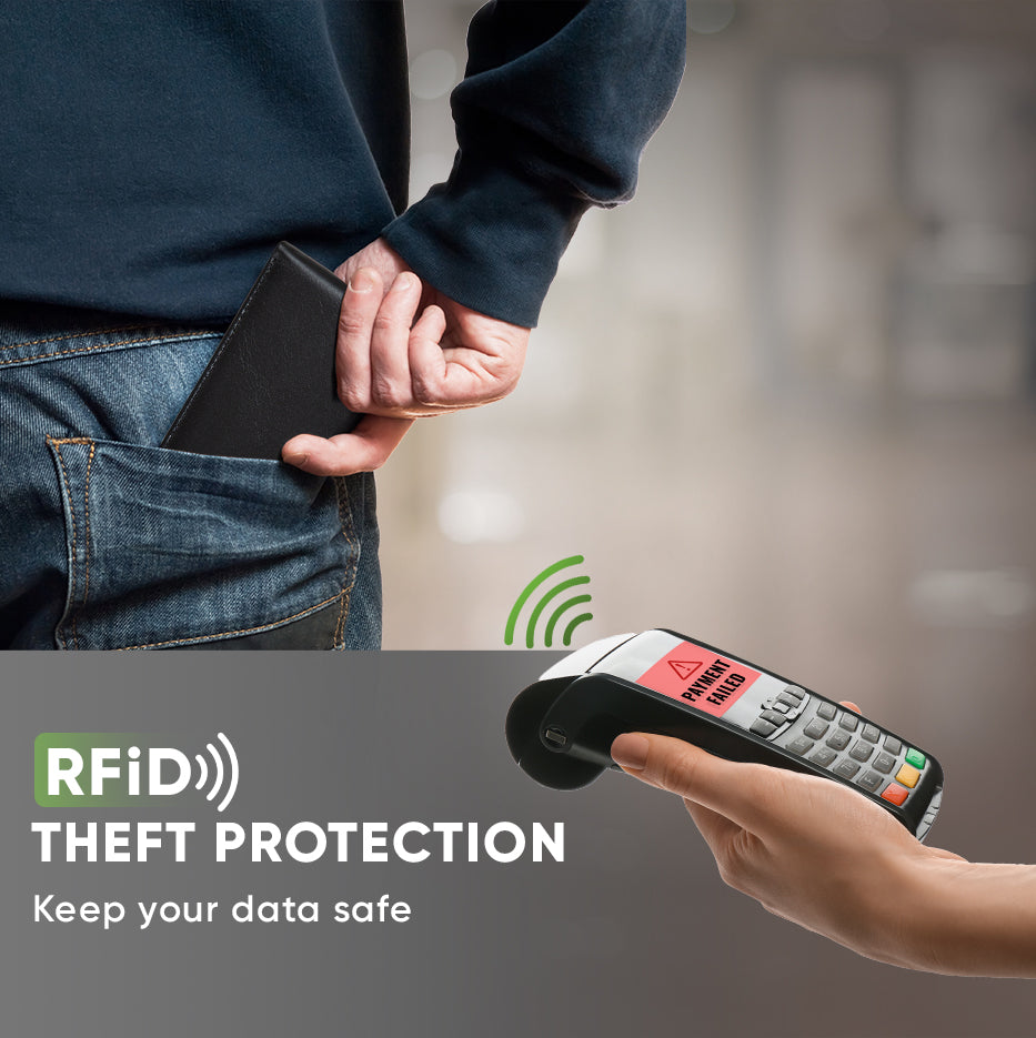 Our wallets are equipped with RFID secure technology, a unique metal composite, engineered specifically to block 13.56 MHz or higher RFID signals and protect the valuable information stored on RFID chips from unauthorized scans.