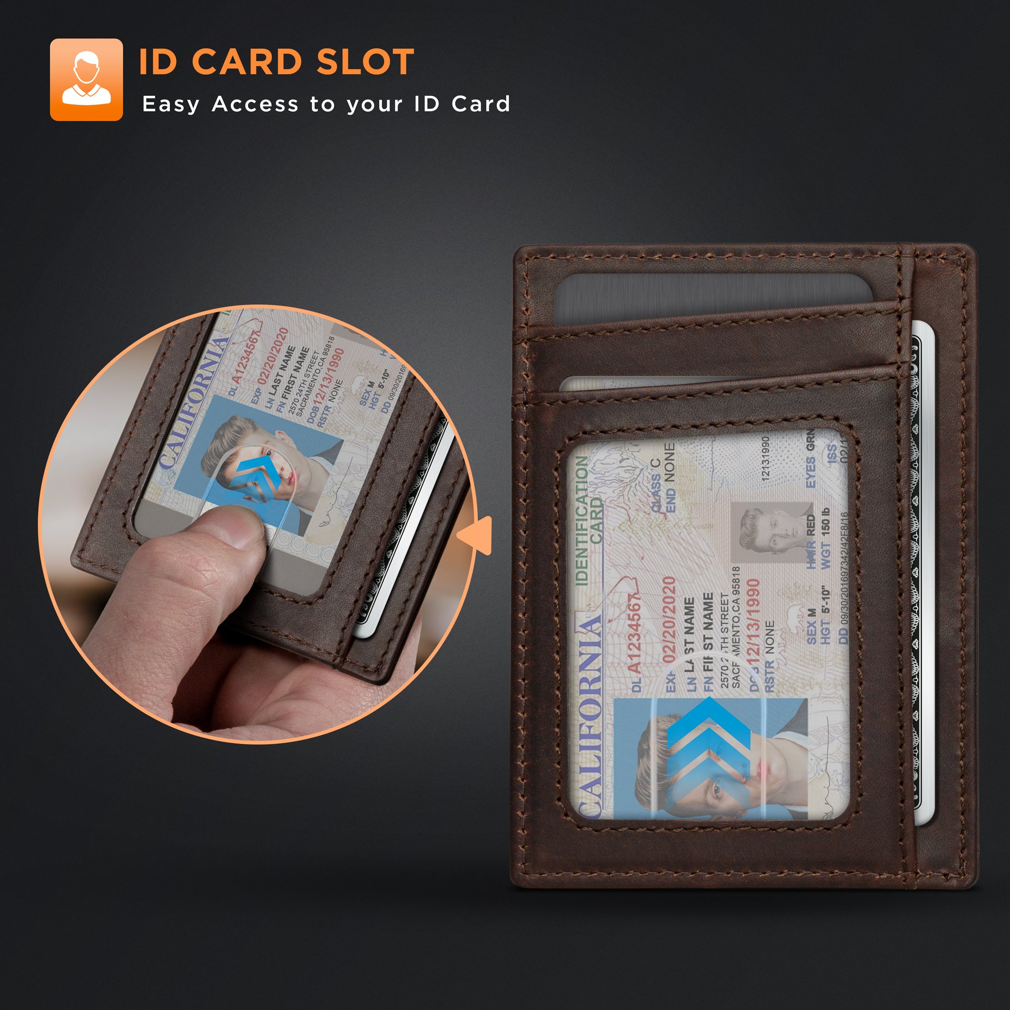 The Maverick men’s modern cardholder is 13.56MHz RFID blocking to keep cards protected, so you can use it safely as a travel wallet. He’s a thin wallet, 4.25 x 3.1”, and half as thick as other “card only” wallets. So whether you have this ID wallet crammed full or not, he’s discrete either way.