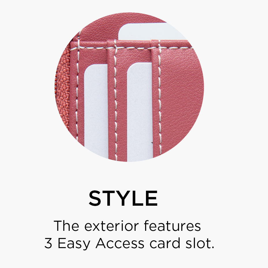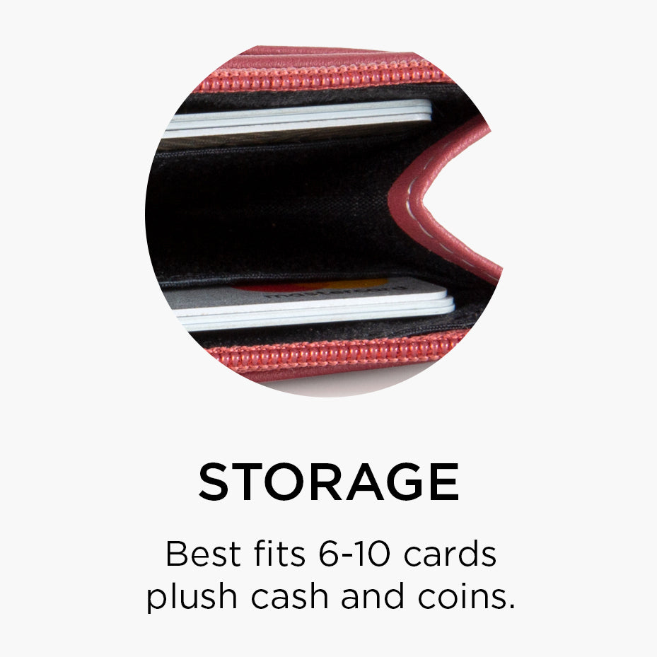 Spacious enough to hold cash, coins, cards, lip gloss, or keys.