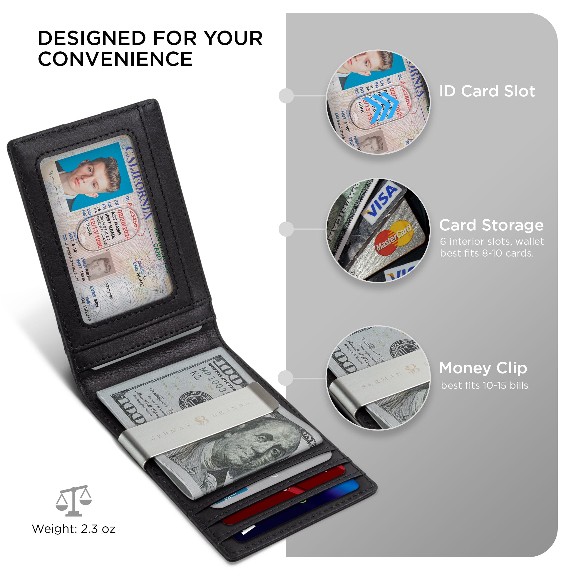 Bifold design, 4.2 x 2.85”, with a stainless steel money clip.