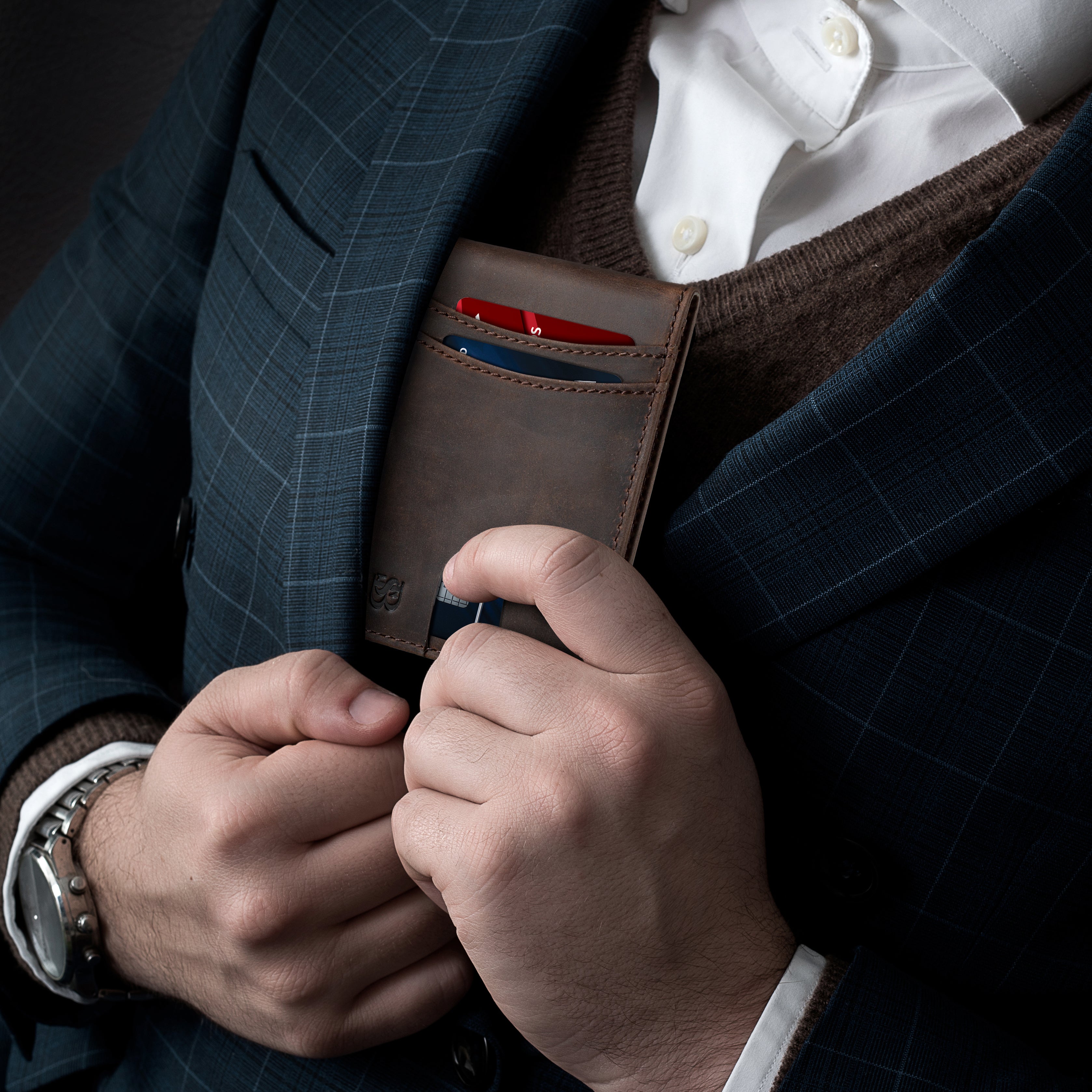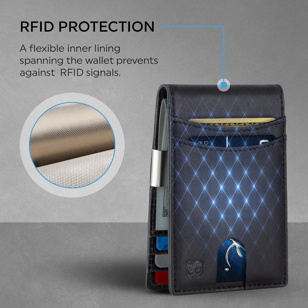 Our wallets are equipped with RFID secure technology, a unique metal composite, engineered specifically to block 13.56 MHz or higher RFID signals and protect the valuable information stored on RFID chips from unauthorized scans.