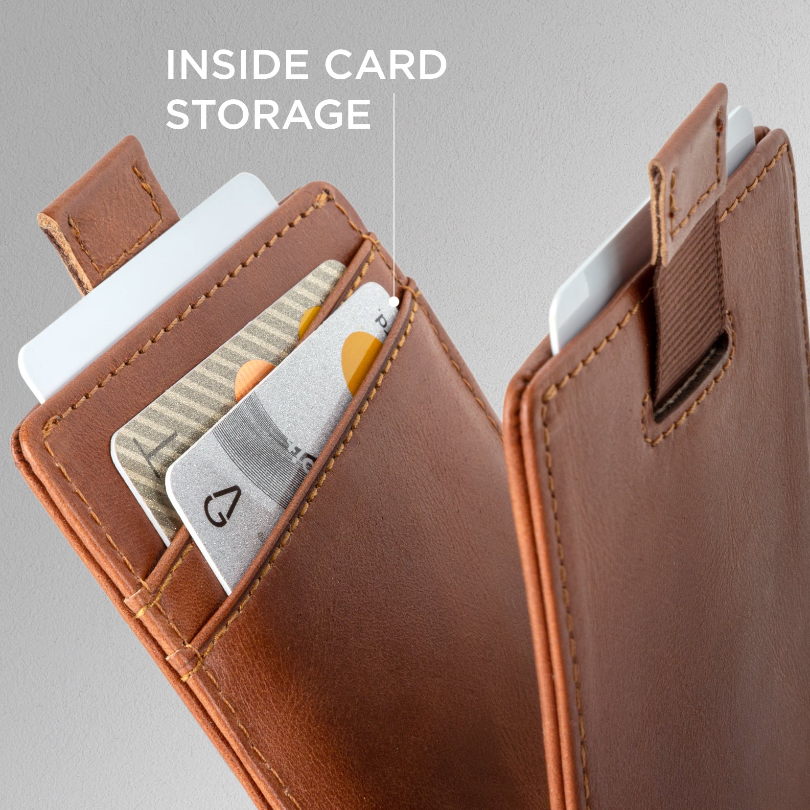 It holds 1-8 cards while maintaining a slim profile. Easily access 1-4 cards with a simple pull of the strap.