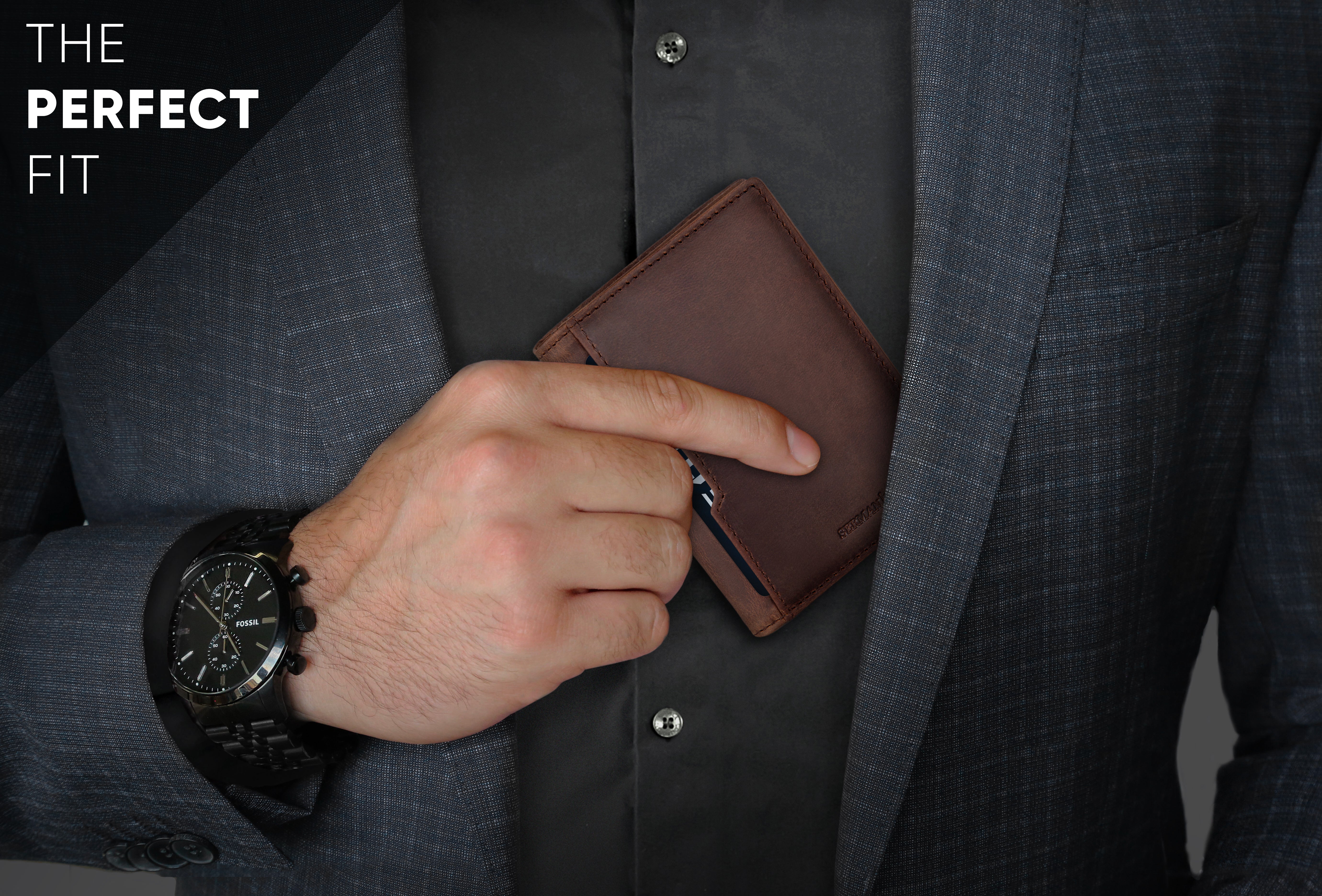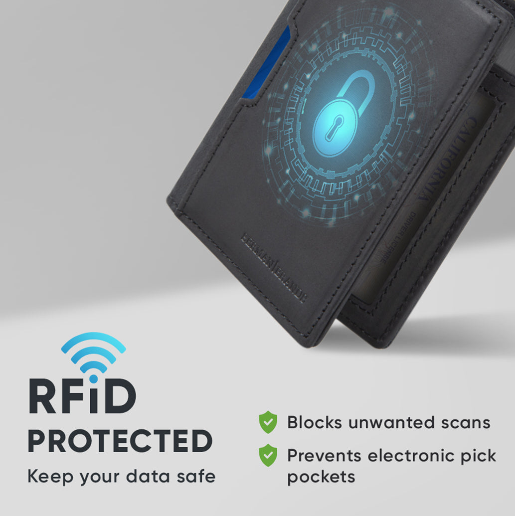 Our wallets are equipped with RFID secure technology, a unique metal composite, engineered specifically to block 13.56 MHz or higher RFID signals and protect the valuable information stored on RFID chips from unauthorized scans.