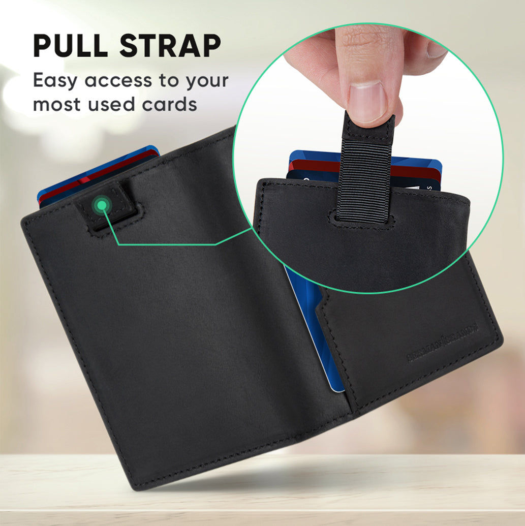 It holds 1-9 cards while maintaining a slim profile. Easily access 1-4 cards with a simple pull of the strap.